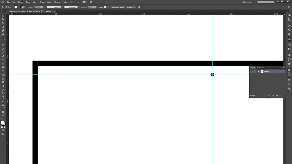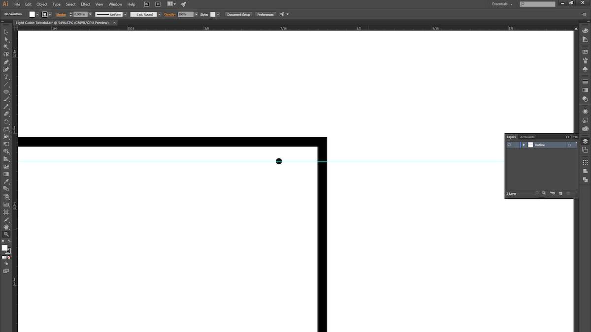 9. Create another guide halfway along the path, and then drag the anchor point (with the white arrow selection tool) just past the guide. Repeat the same process with the last circle, but move its anchor point about half an inch to the right.