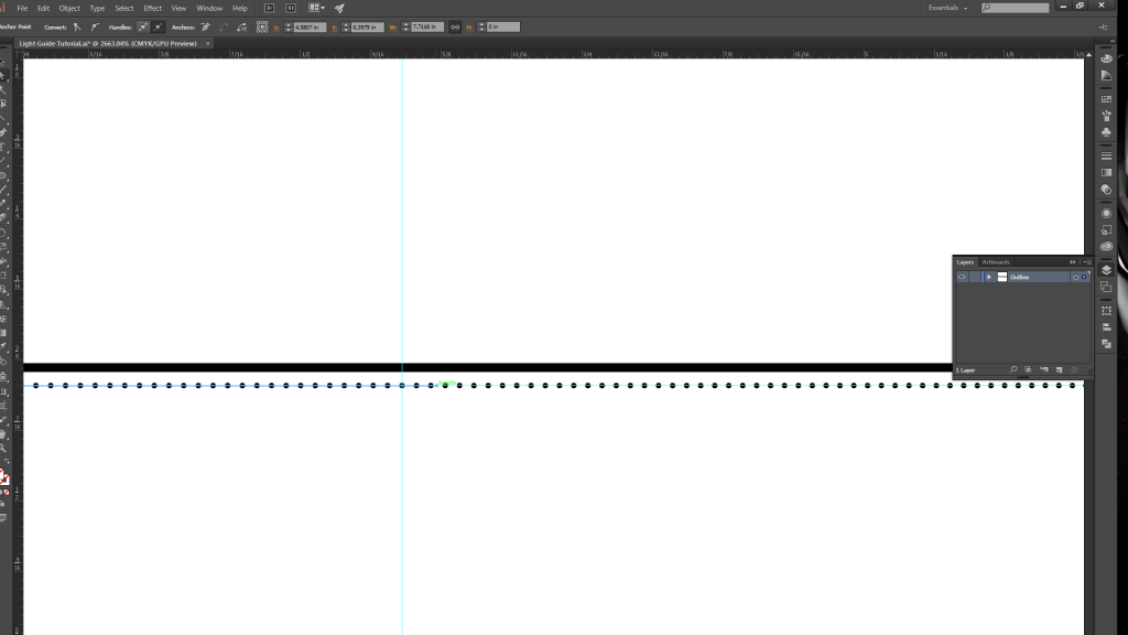 2. Make a guide and space it roughly 1/4" away from the edge of the rectangle. This is where the dimple pattern will begin. (Leaving a 1/4” margin allows us to later mask off the area to prevent seeing excessive LED brightness near the source in the light pipe.) Now draw a circle with a .005" diameter.