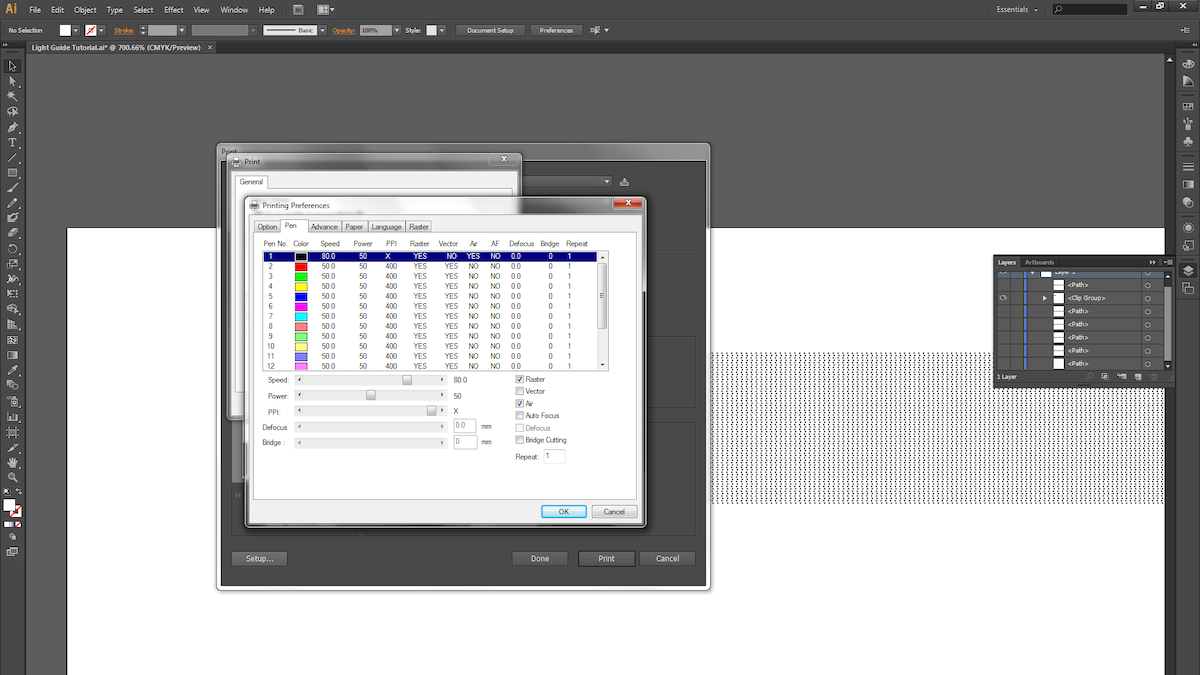 19. Different laser cutters have different settings for varying materials and thicknesses, so keep that in mind when choosing your settings. We used a speed of 80, power of 50 and maximum PPI for the raster. For the vector cuts, we took 4 cuts at speed of 4, power of 95, and maximum PPI.
