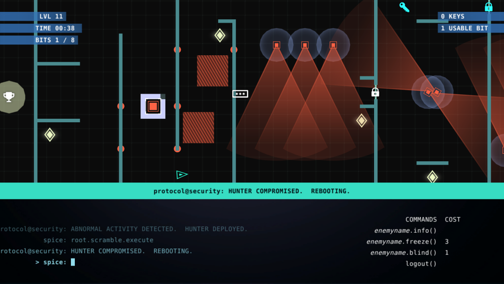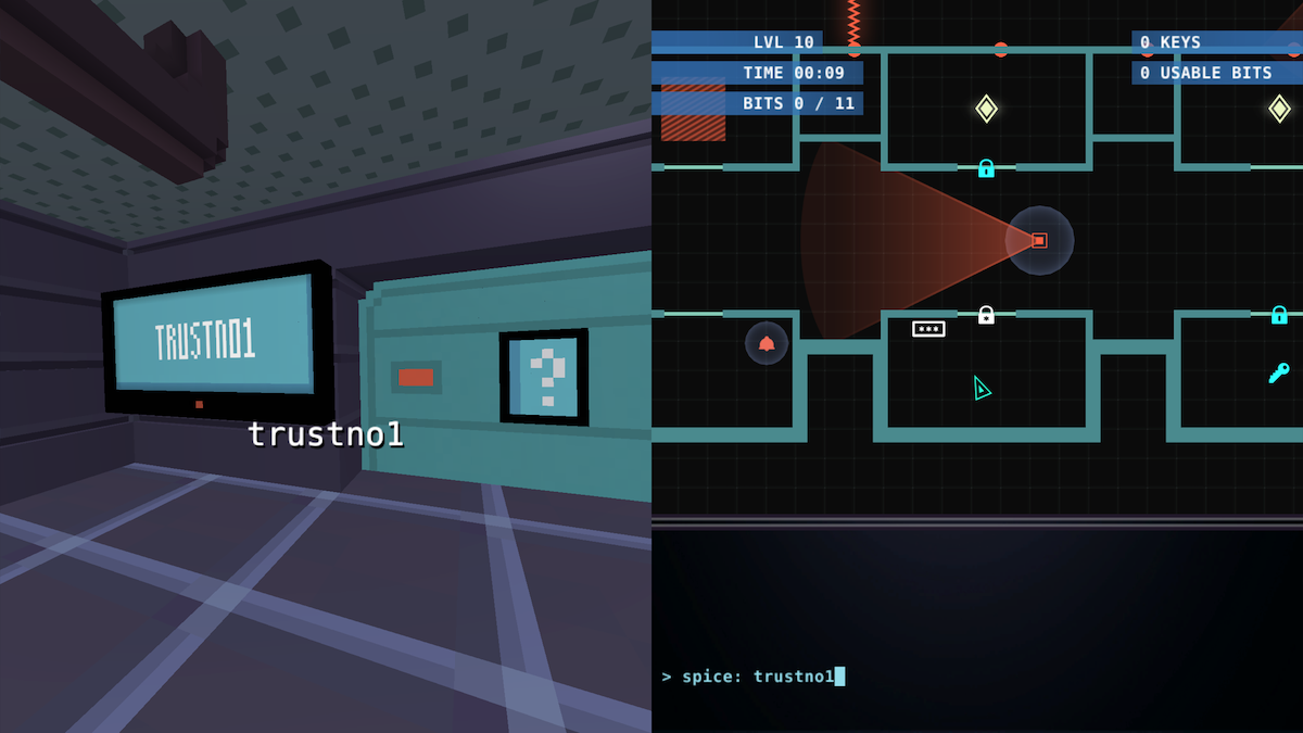 Since each of the players sees a different screen (one in 3D and one in 2D), we tried my best to play to the strengths of each medium. VR is great at immersive and suspenseful experiences, so the VR player is the player of action, sneaking around to get treasure and running like hell to escape from enemy agents. A screen is great at showing flat data, and the player who sees it has access to a keyboard. So the hacker player sees a very detailed map and types to control everything.