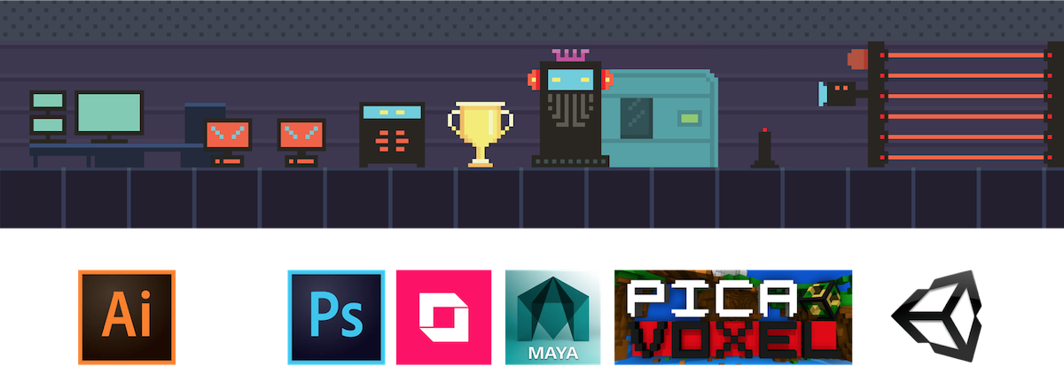 Our art pipeline got pretty crazy. I made the 2D assets in Illustrator so that I could avoid fussing with the resolution. For 3D assets, I made pixel sketches in Photoshop, turned them into 3D voxel art using Qubicle, played with the textures in Maya, and transferred models to Unity using Picavoxel. Finally, I set up prefabs in Unity so that I could easily swap the art in and out. The process allowed me to quickly pump out consistent and professional art, and instantly test it out in VR—a huge help for a solo artist.