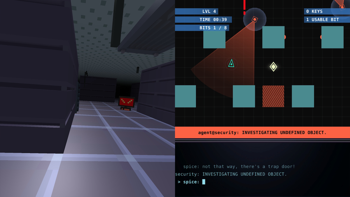 Cooperation is critical to this game. We designed it be impossible to win by yourself—unless you cheat by looking at both screens. The VR player determines where the game goes, but there are agents around the corner that only the hacker can see, as well as hidden trap doors and lasers. On the screen below, the VR player is blocked by a door. But there’s a password that they can give the hacker player to unlock it.