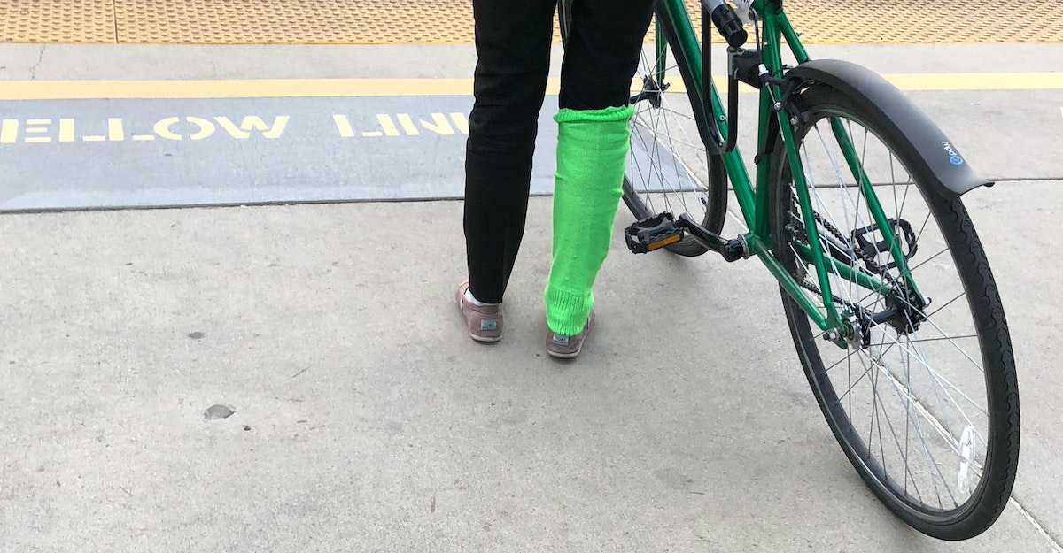 I took this picture at the train station right next to our Palo Alto office. At first glance, I thought it was an unusual fashion statement, but then I realized that the woman in the picture solved a common problem in an elegant way: When your bike lacks a chain guard, your pants can easily get stuck and you risk destroying them—or even causing an accident. By wearing a cut-off sock above her pants she kept them protected from the chain. By going with a chartreuse sock, she made sure she wouldn't be overlooked in the aggressive Bay Area traffic.