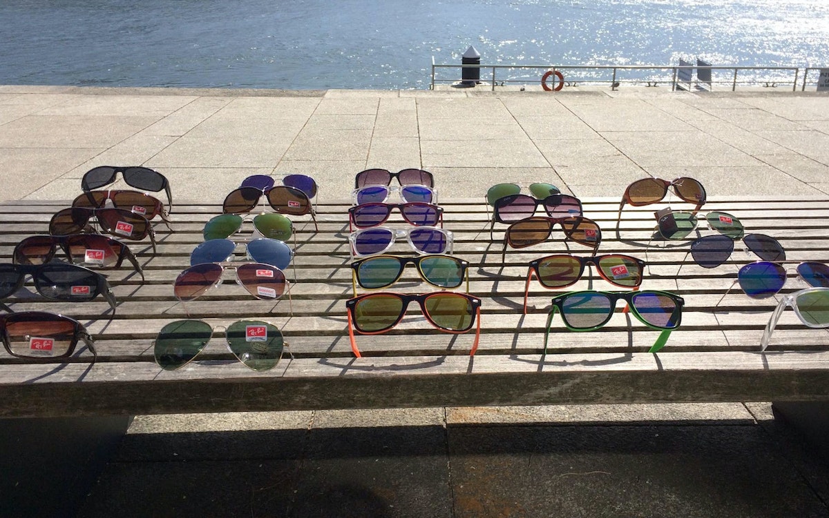 Strolling down the Porto’s Rio Douro in the bright, spring sun, a Thoughtless Act caught my eye. A man selling knock-off sunglasses had thoughtfully—or instinctively—used the bench he'd been sitting on to display his wares.