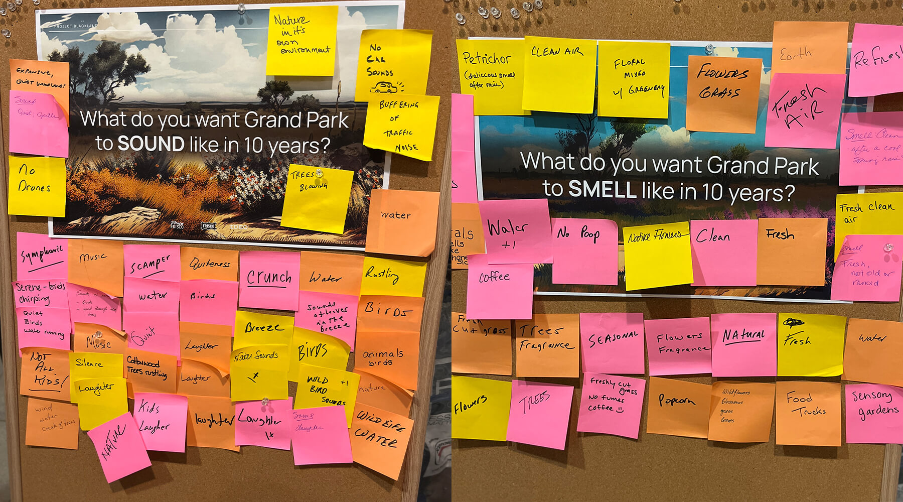 Next, IDEO brought in multisensory design prompts to help participants further conceptualize the park. How did they want it to feel, sound, and smell? In the built-up, suburban city of Frisco, residents imagined a space that was less planned, enabling guided wandering and exploration. They also hoped that the park would inspire loved ones and descendants to feel a sense of curiosity and wonder.