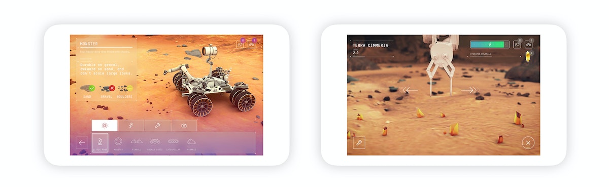 Students use tablets to design their own Mars rover. Each rover appears on a large screen and traverses the planet’s extreme terrain. The goal is to collect data that suggests life on Mars, including ice deposits, photos, and more. Students iterate on their rover’s design—wheels, power sources, and sensors—to test if it can stand up against dust storms and craters. The team consulted a NASA planetary scientist to ensure accuracy, as well as educators to establish cohesion with classroom curricula.