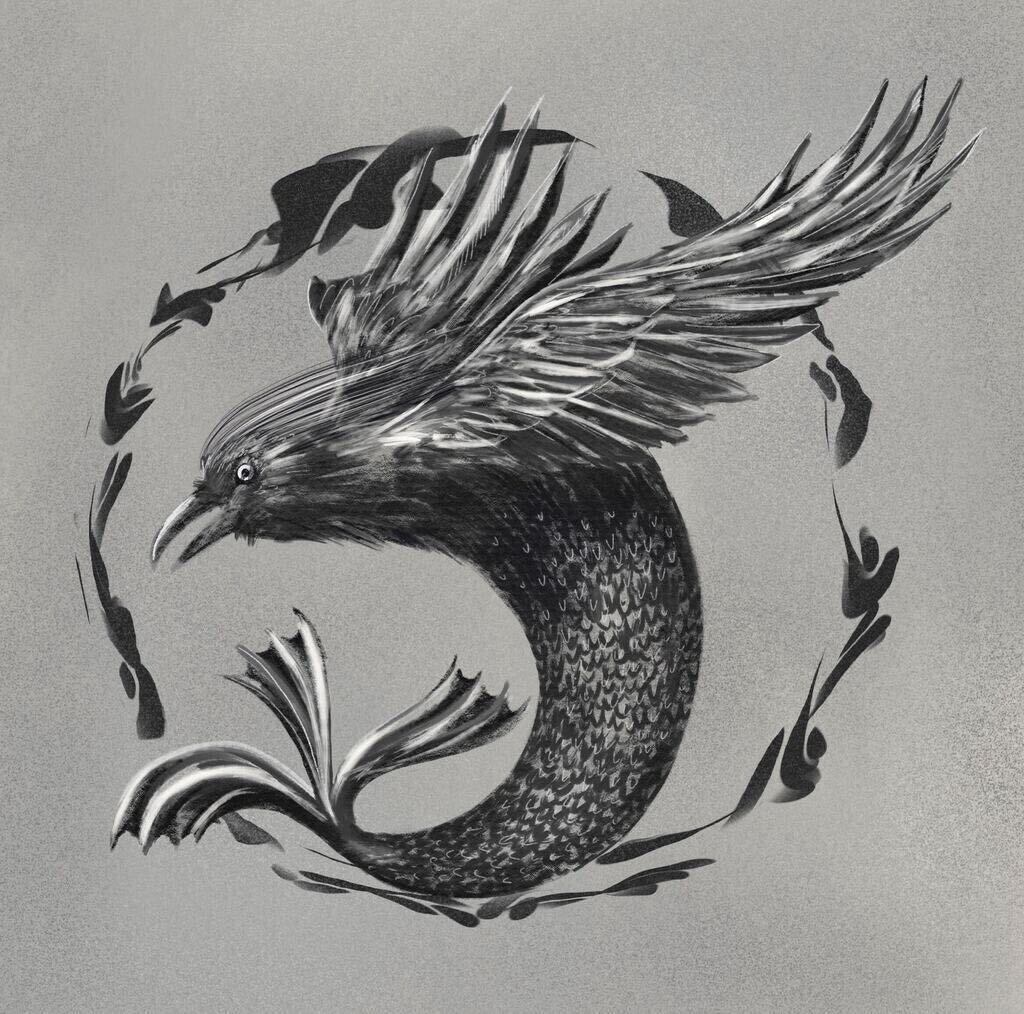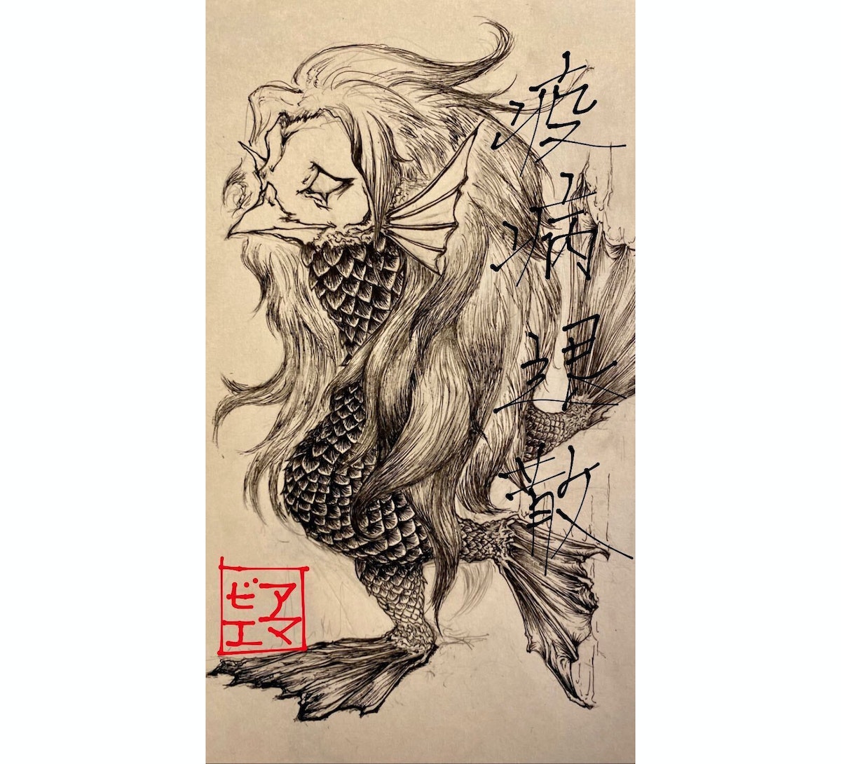 "The Amabie illustration from the Edo period depicts it having three fin-like legs. “Three-legged” seems to be a common motif for divine creatures in Japan (like Yatagarasu), so I wanted to emphasize the legs and express its divinity through pen and ink strokes. I also wondered and researched how Amabie could’ve walked with its fin-like legs, resulting in legs that resemble those of pinnipeds. The four Kanji characters mean “warding off disease” and the little red seal says Amabie."