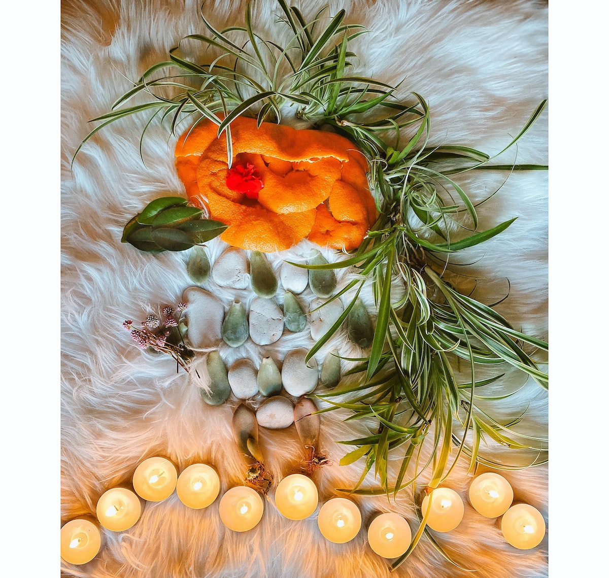 "I was inspired by Amabie creating ripples of growth and resilience. As a plant enthusiast and forager, I made an altar collage of natural materials—including many plants propagating in my home as I shelter in place. I hope my amabie interpretation prompts a pause of reflection to honor our collective strength in the face of adversity."