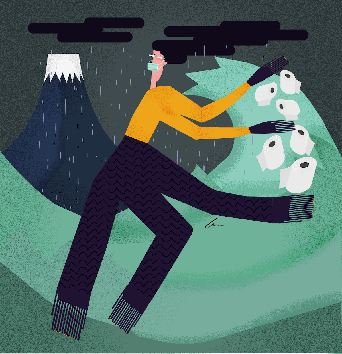 "Mythology says she’s the entity announcing epidemics, so I wanted to compare the intensity of the crisis to the power of a sea storm, which she impersonates. The toilet rolls and the face masks, hiding her beak, are pinning this image down to our present day, making it undeniably 2020."