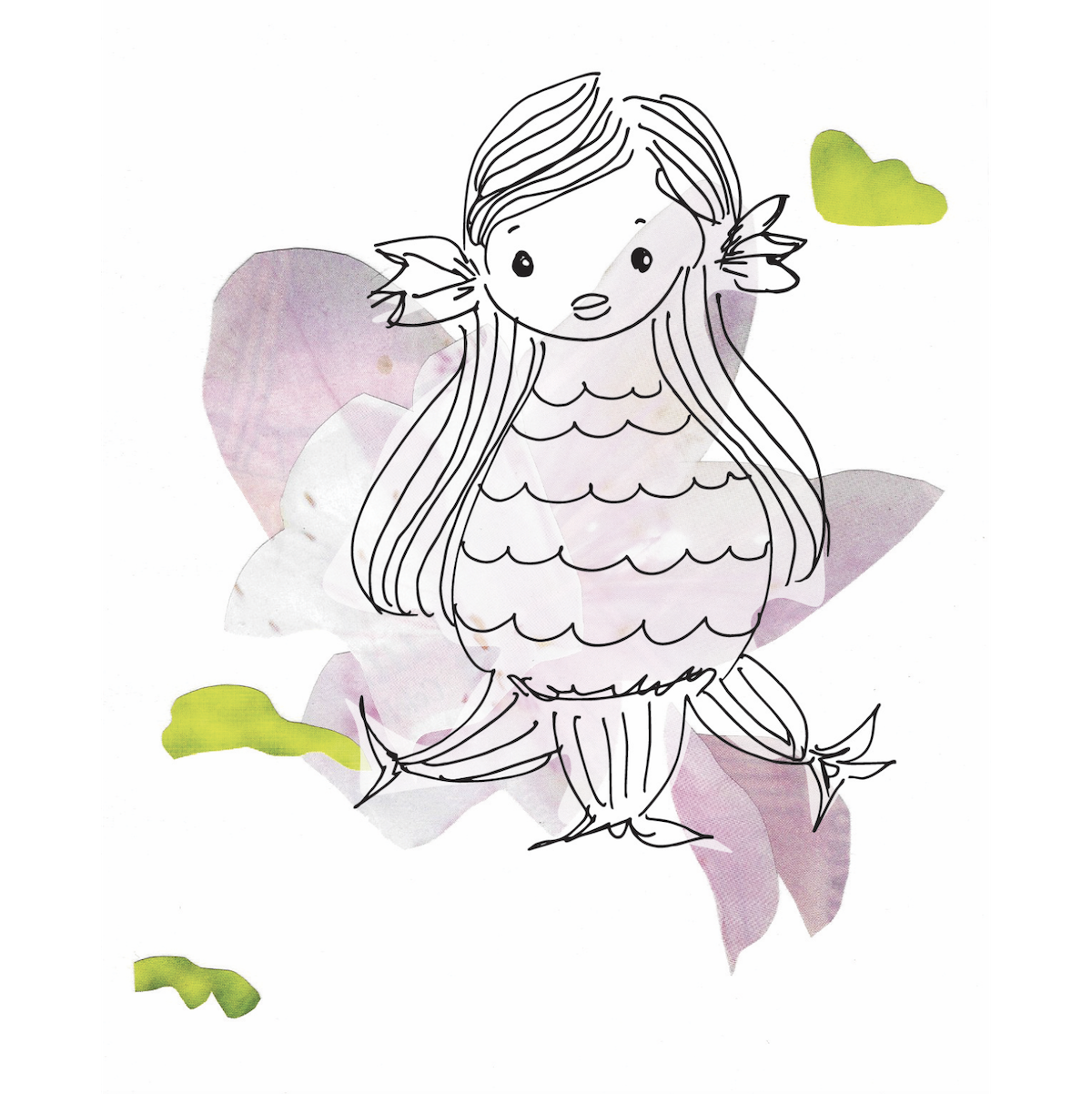 "With a symmetrical body, a neutral yet whimsical expression, and textural strokes throughout her bulbous hair, I hoped to capture the essence of the Amabie as a welcoming and warm creature who symbolizes the hope we all need during these uncertain times. She is an imaginary being whose spirit allows us to pin our future dreams and desires onto her elusive existence."