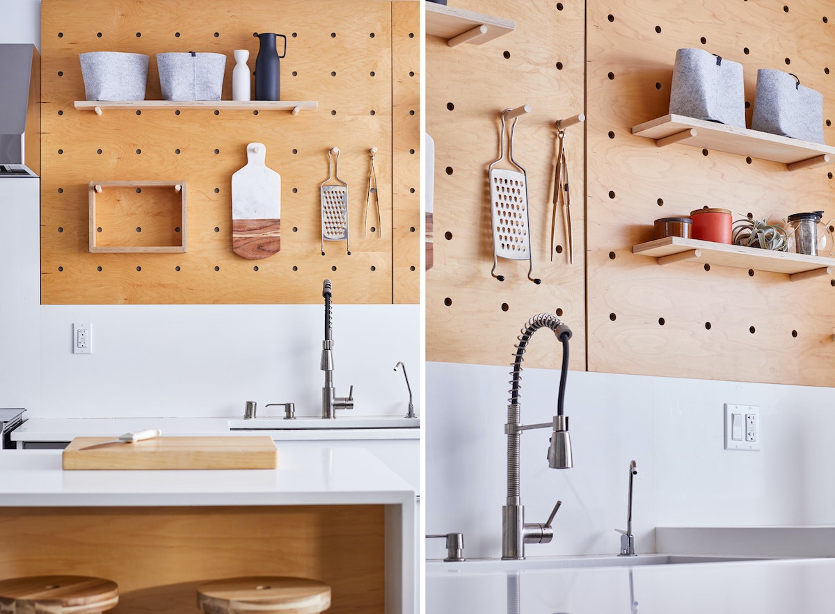 The main wall above the sink is made from plywood panels cut with a CNC machine to look more like pegboard. The design, which uses movable dowels, makes it easy to add or adjust shelves to meet the needs of the cooks.