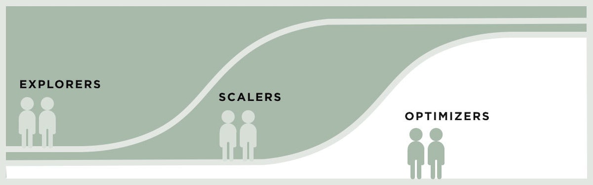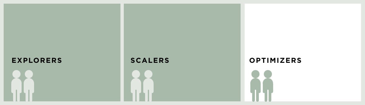 How should you create a smoother handoff between teams? In short, you can avoid a drop-off by tailoring each handoff to the teams involved. In many companies, innovation teams tend to fall into three buckets: Explorers, Scalers, and Optimizers (with credit to Bud Caddell and Simon Wardley).