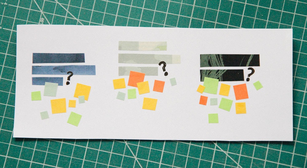 After the questions are introduced, everyone goes heads-down and captures ideas. It's a lot of silence, but it allows those who prefer to think and brainstorm silently the time and space to do it. When everyone has reached the bottom of their stack, one person volunteers to share first. As she presents, others add similar ideas or build on top of them to draw out themes.