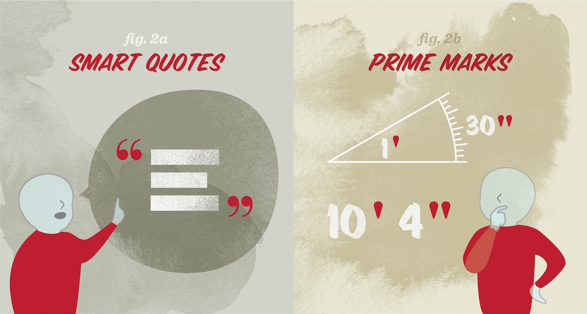 Prime marks ( ' ), also known as straight quotes or dumb quotes, are often accidentally used in place of smart quotes ( ‘ ), also known as curly quotes. Prime marks are a remnant of the typewriter, which only had prime marks to save space on the keyboard. So what’s the difference? Prime marks are used for units of measure (feet, inches, seconds, and minutes); smart quotes are used to indicate something someone has said.