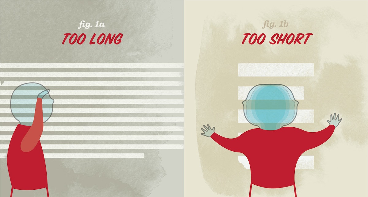 The length of a line determines how much distance the reader’s eyes must cover to read it from left to right. Long line lengths make the text seem never-ending. Short line lengths make the reading experience erratic, and can cause the reader to miss important words. An ideal line length is 66 characters (including letters and spaces). For one column of text, aim for 45–75 characters per line; for two columns of text, 40–50 characters per line.