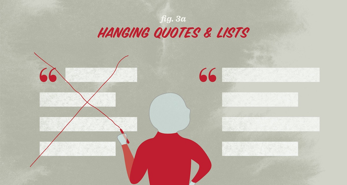 Hanging text, or outdenting, means moving typographic elements into the left margin. You do this to create a consistent vertical axis along the left end of the text. Quotes, bullets, and dashes do not take up as much visual space as a letter, so a list or quote that has not been hung, or outdented, can sometimes be mistaken for a new paragraph and cause unintended breaks in the reading rhythm.