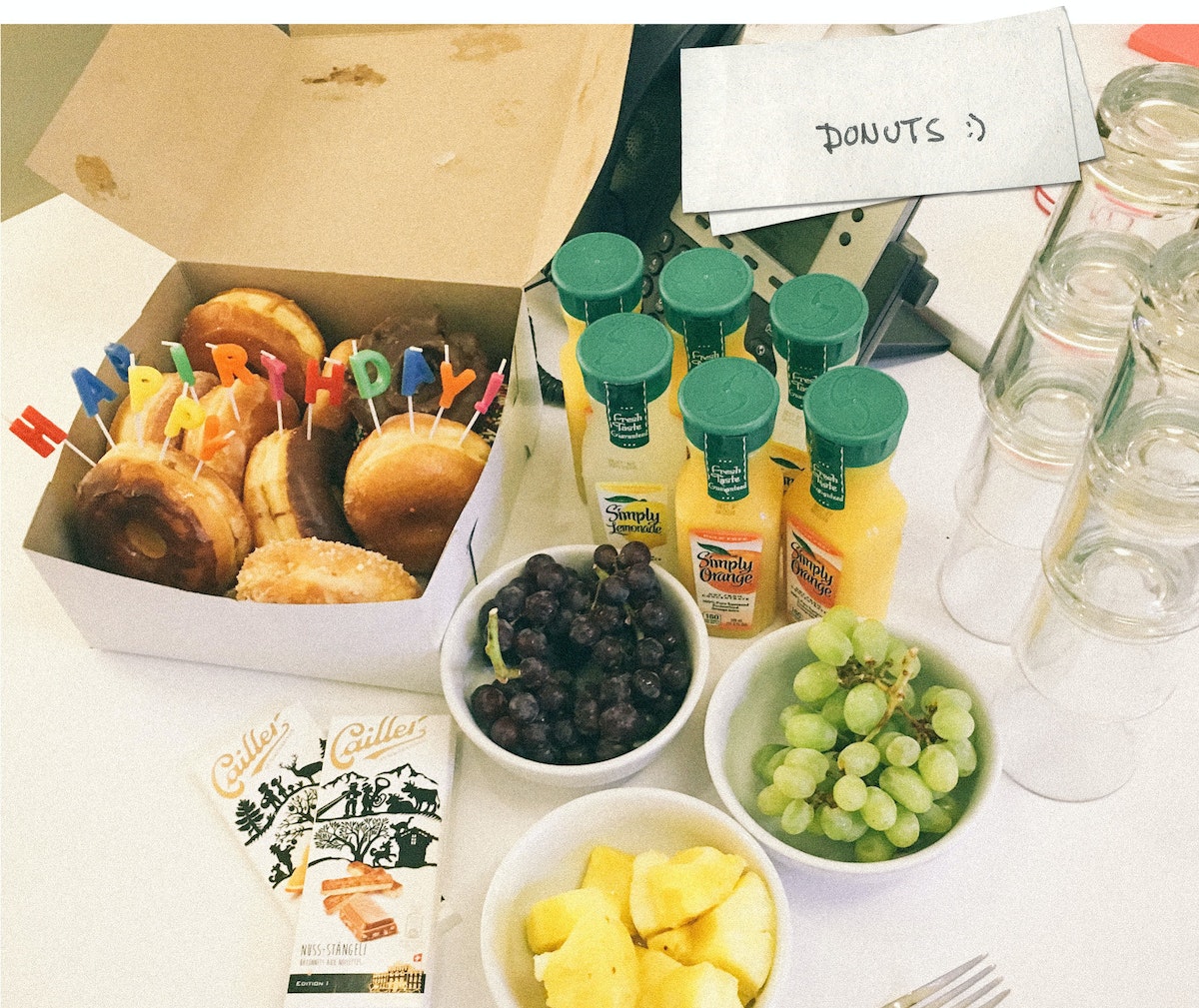 Today is my teammate Julian’s birthday, so we surprised him with donuts and orange juice—his morning elixir of choice!
