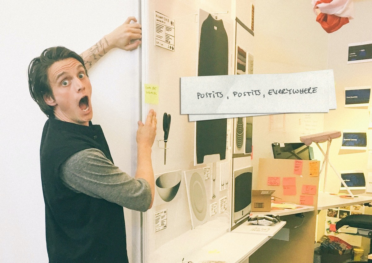 We do team check-ins throughout the day, talking through our ideas to make sure we’re meeting user needs and pushing the integration of digital behaviors and physical environments. Today, we’re critiquing a bunch of sketches of critical shopping moments that we’ll prototype later. We’re considering how digital projection can add ambient information and subtle interaction to a physical display layout.