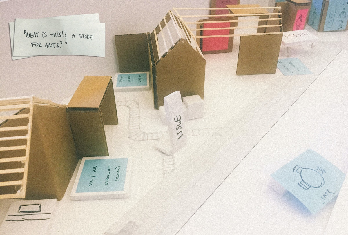 In preparation for our prototyping session in the IDEO Shop, we use a rough physical model to map out the experience of the future retail environment. A small-scale model lets us discuss all the ways shoppers might interact with a brick and mortar store—from browsing to comparison shopping, saving for later or checking out and having things shipped home. It’s helpful to keep our work quick and dirty, so that we have a model that lets the entire team walk through design points together.