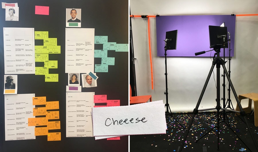 When we're designing new experiences, stock image/video sites don't cut it, so we create them from scratch. Here's our B-roll where we're planning who will be playing the role of the user in our narrative, and sketches of what the scene will look like. We included confetti in one of our photos ;)