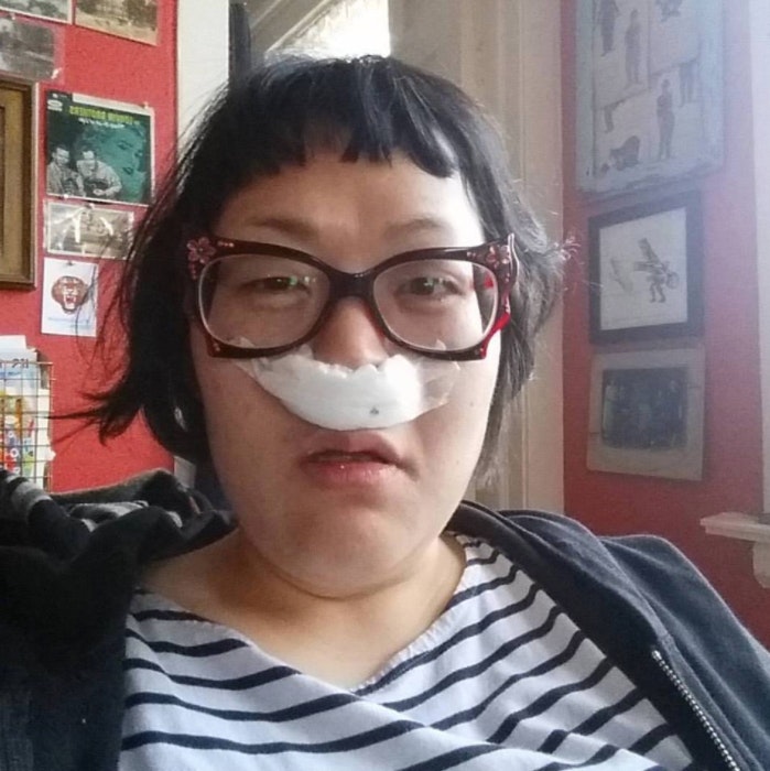 It was 2012 and I was 32 and uninsured at the time. I lived for six months with a big lump on my neck. I avoided it. I knew it was bad when my doctor didn’t make me wait after getting the results back. It was thyroid cancer and it had spread to lymph nodes in my neck. I had a nine-hour surgery to take everything out, but the tumor had grown around my vocal nerve. The next day in hospital room, I woke up with a paralyzed vocal nerve. I went from someone who was always very loud, to someone who didn’t have a voice. It was very weird. I had to drink radioactive iodine as part of my therapy, which is nasty and why I’m having surgery to repair my tear ducts.