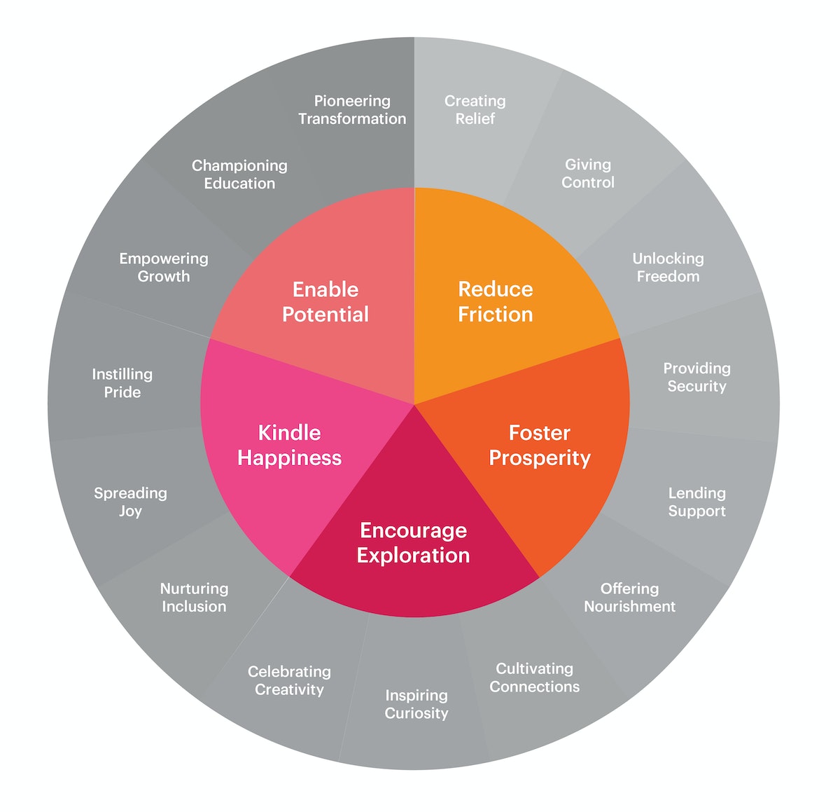 Inspired by Maslow’s hierarchy of needs and what motivates human satisfaction, we created a purpose framework called the Purpose Wheel. (Spoiler alert: We'll have a version of the wheel for you to download at the bottom of this post.) The idea is that groups of people working together—both large and small organizations, as well as teams and individuals—can find a sense of purpose if they’re able to first imagine various ways they might have impact on the world.