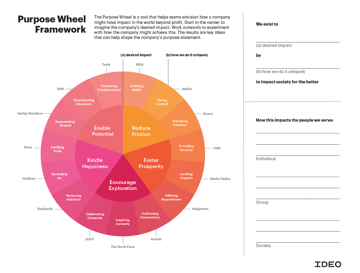 The center of the wheel suggests five ways a company or organization might have an impact on the world. Each slice answers the “Why do we exist beyond profit?” question in a different way.