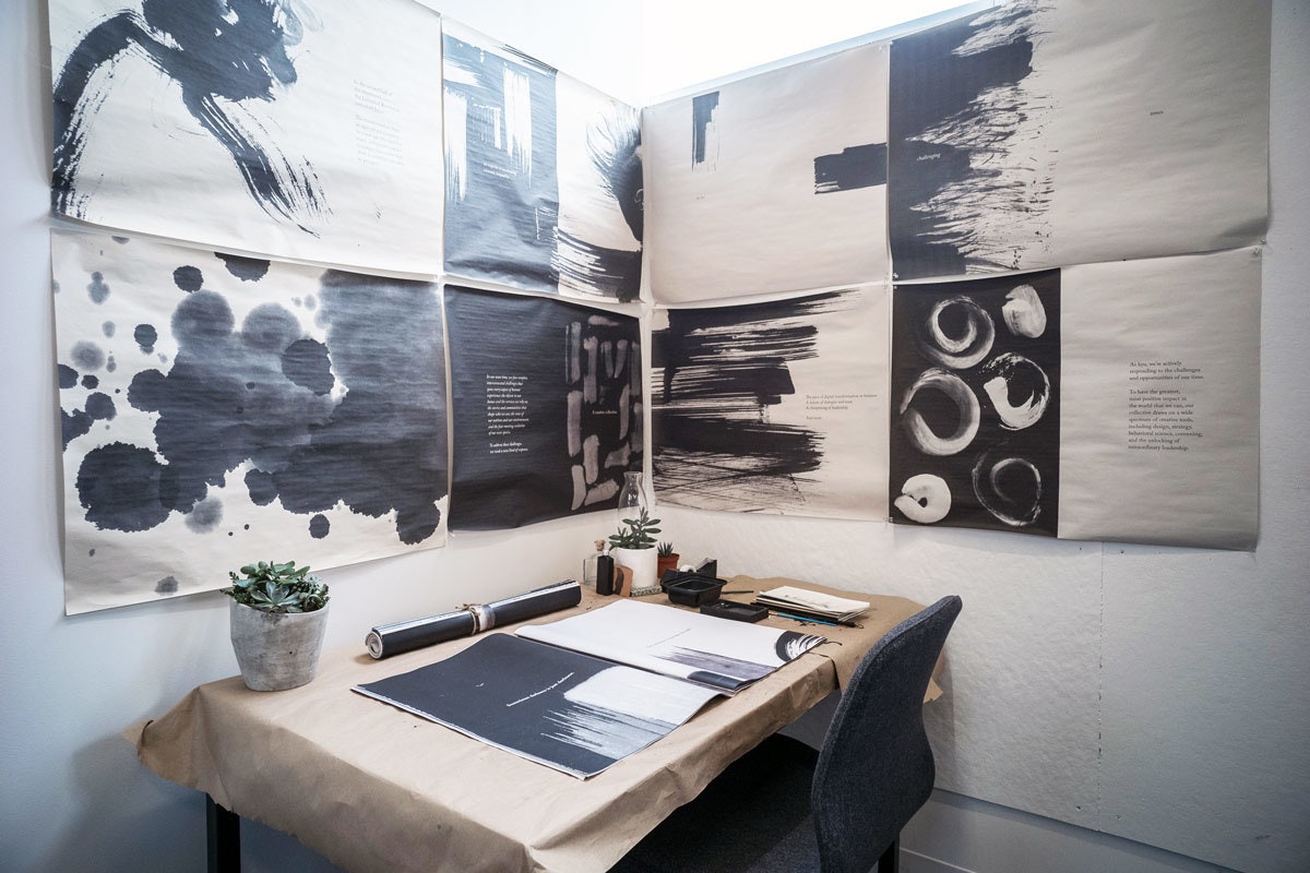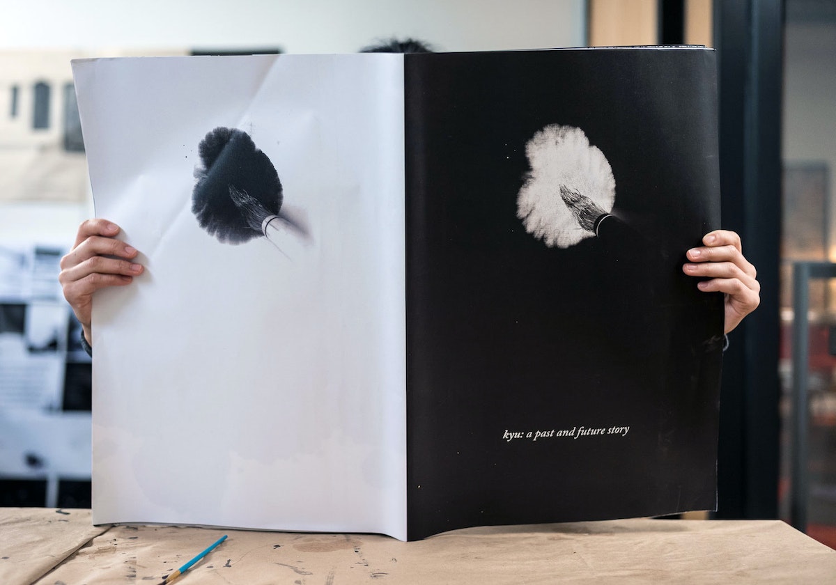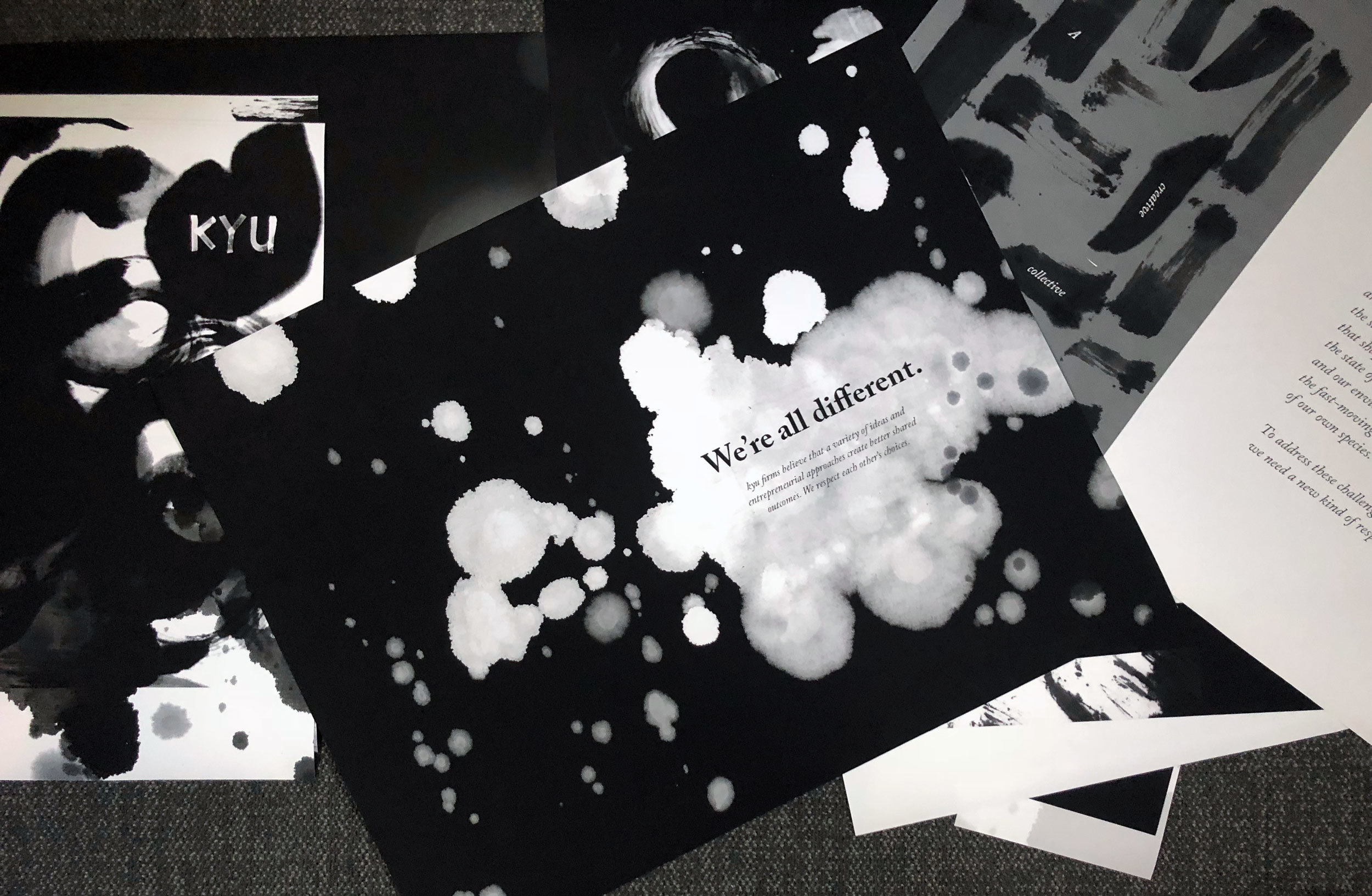 The companies that make up kyu share a belief that creative collaboration will yield new solutions. To visualize the collective, I drew the first dot directly with the brush and then started to draw circles. Dots and lines, the basis of musical notation, helped me orchestrate the story visually. Rough strokes conveyed complexity and sometimes chaos, while the diffusion of ink into paper illustrated the calm conclusion of a journey. When the magazine reached a crescendo, the dots began to jump around wildly. The combination of ink and water unified sense and sense, and the story of the newspaper came to its happy end.