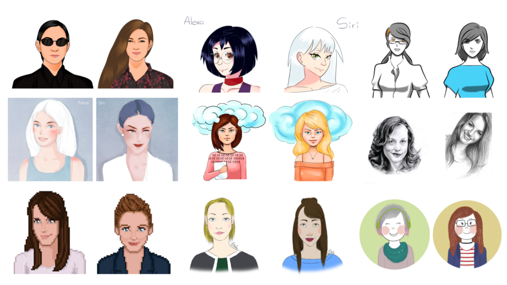 I recorded a video interview with each voice assistant and handed these over to a number of illustrators commissioned via the social gig site Fiverr. While a few of the artists had previous exposure to the bots, I was able to source English-speaking international artists in markets where Alexa and/or Siri were not available. Countries of origin included Indonesia, Pakistan, Ukraine, Venezuela, the Philippines, and the U.S. For many of them, my videos were their first meaningful exposure.