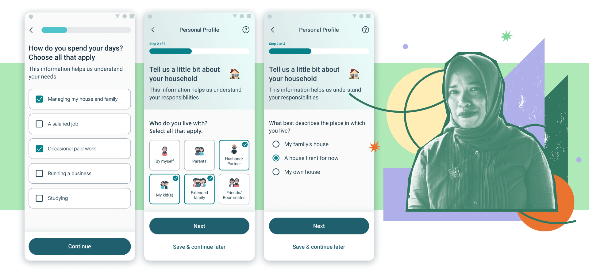 Why? Many underserved women live in a world that’s mostly person-to-person and not very digital. They’re more likely to share a smartphone, and they juggle so many responsibilities as mothers, caregivers, and informal workers, they have limited time and bandwidth to try and learn new digital services.