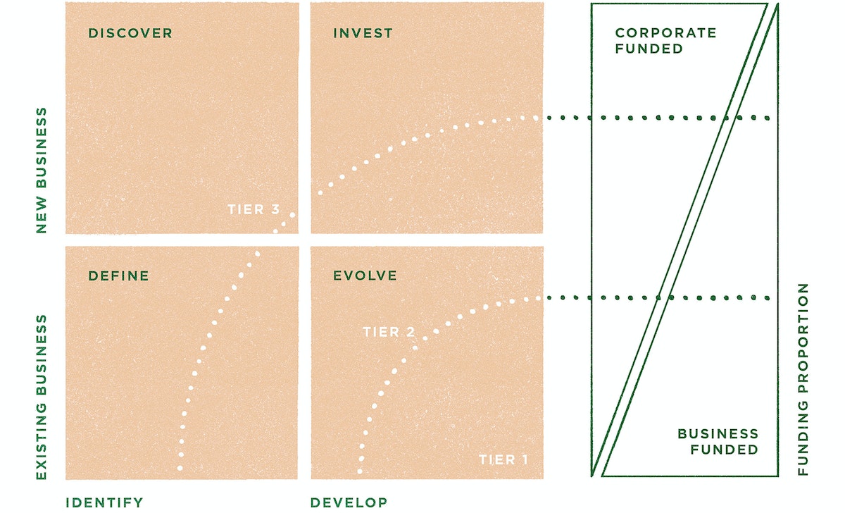 So, what happens when a business unit pays the tab? Although leaders are more invested in the outcomes (literally and figuratively), their demand for innovation is far lower. When betting their own money, most people prefer sure things—even when the expected returns are the same, they choose an option that’s easier to predict. So, how do you promote riskier bets? With corporate funds. We often see these corporate subsidies falling into three tiers. This model isn’t just true for how business units spend their money, it’s also true for how they assign their best people. They aren’t likely to put their best people on their riskiest projects.