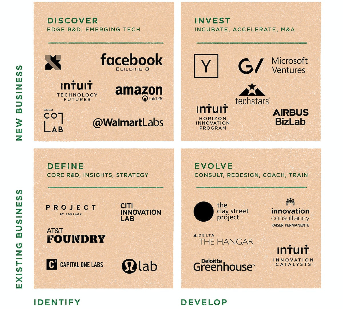 As shown in the above graphic, Discover teams focus on uncovering new insights or opportunities that could be developed into new businesses or offers. This long-term innovation work includes the efforts of R&D labs focused on emerging technology. Those in the Invest quadrant develop, launch, or acquire new businesses in the short term. This includes the work of M&A teams, accelerators, incubators, and corporate venture capital. Define teams initiate tangible strategic visions for how existing business units may need to evolve to succeed in the future, and reveal opportunities for how current offers can adapt to changing customer demands or new technologies. And lastly, Evolve teams differ in that they partner with existing business units to adapt to a changing environment—develop new offers, approaches, and skills to improve the business in the near- to mid-term. This includes the services offered by SWAT teams, internal agencies, and coaches.