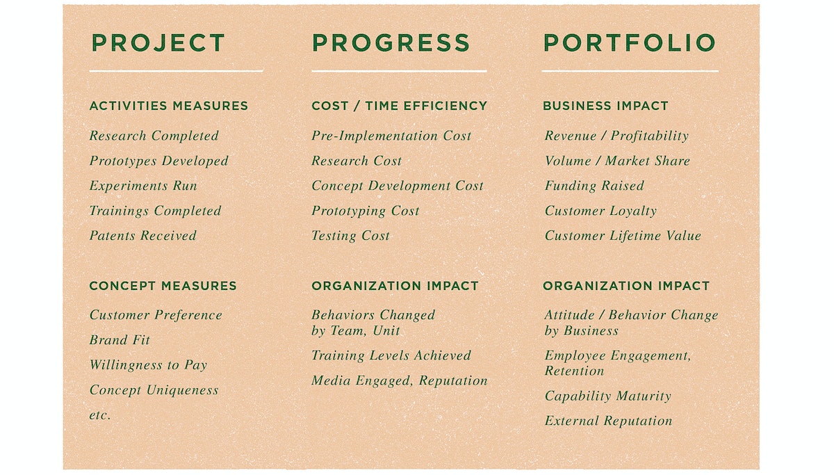 One sneaky reason that so many companies throw away good money on bad innovation efforts is that innovation may take years to show impact on metrics that the business units typically track, like revenue, profit, lifetime value, or customer satisfaction. But that doesn’t mean that innovation teams can’t show value in the short term. By setting simple baselines, teams can measure progress over time, showing that their work improves outcomes, drives efficiency, or changes behavior. These progress measures demonstrate indisputable value, and can often satisfy skeptical stakeholders in the short term—until innovation’s portfolio of work hits the market and begins to generate real growth.