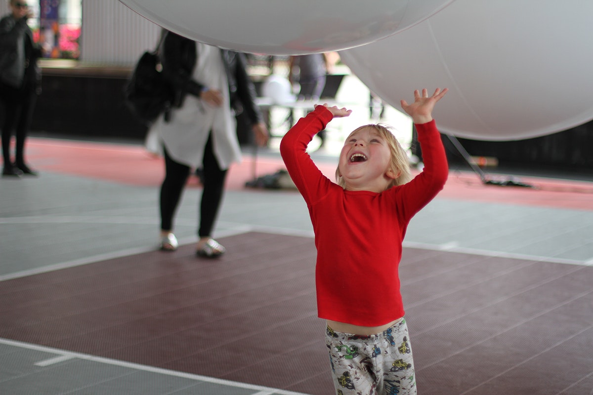 We wanted to be certain that participants could hear how they were changing the music, so while the background music played evenly throughout the installation, each individual beach ball generated a sound in the speaker closest to it—kind of like stage monitors that bands use playing live. That feedback encouraged everyone to play more.