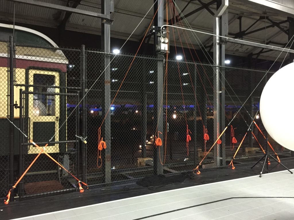 When we got to the venue, we had to invent a rigging system to get the beach balls to hang at the right place and height. In a divine moment of MacGyver-like inspiration, Diem Ho devised a hierarchical beach ball wiring system that could be lowered and raised quickly with precise control. When we were swarmed with little kids, this system allowed us to raise the beach balls just enough so people could see little kids behind a beach ball and avoid hitting them; things became a lot safer.