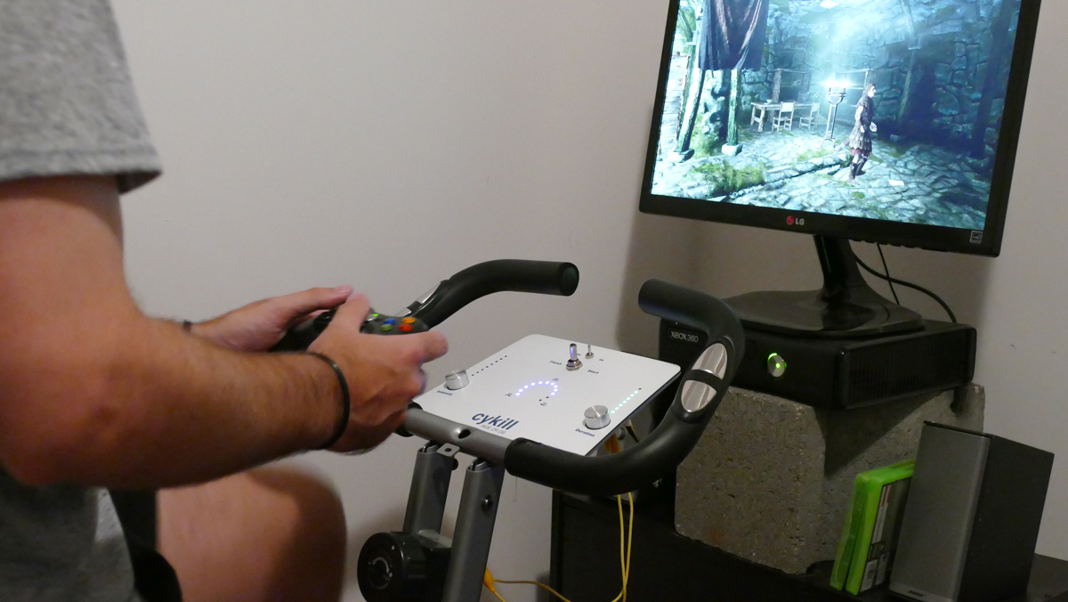 Alex on the Cykill, an exercise-bike-gaming-console that interrupts your game if you stop pedaling.