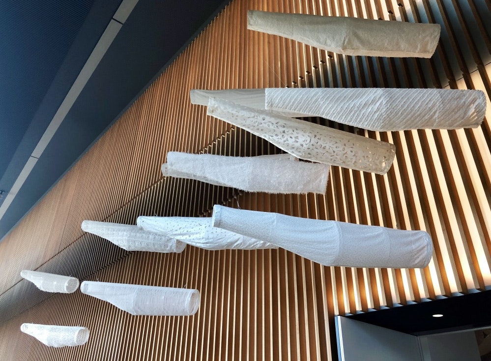 Here, all 300-something textiles designed by Sudo for the installation could be seen up close, touched, and read about in detail. Each textile had a background story. Here were two of my favorites: