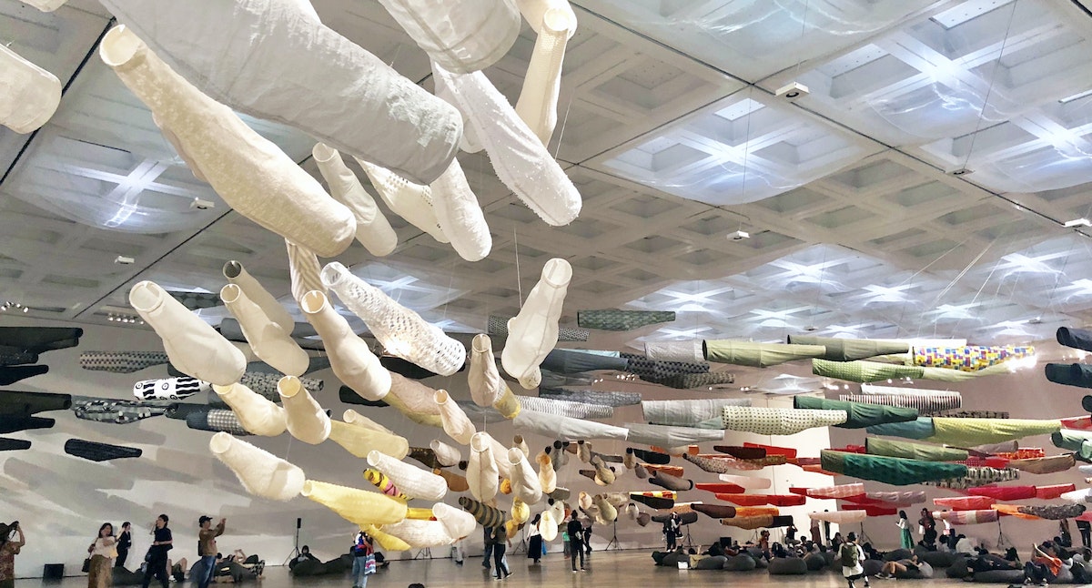 A school of white carp streamers floated by the entrance like phantoms beckoning people into the exhibition. Following them in, the room opened up to reveal over 300 textile carp swimming through the air in a sweeping gradation of colors. The mesmerized audience was free to wander, take photos through the carp streamers, and lay down on Muji bean bags to absorb the show at their own pace.