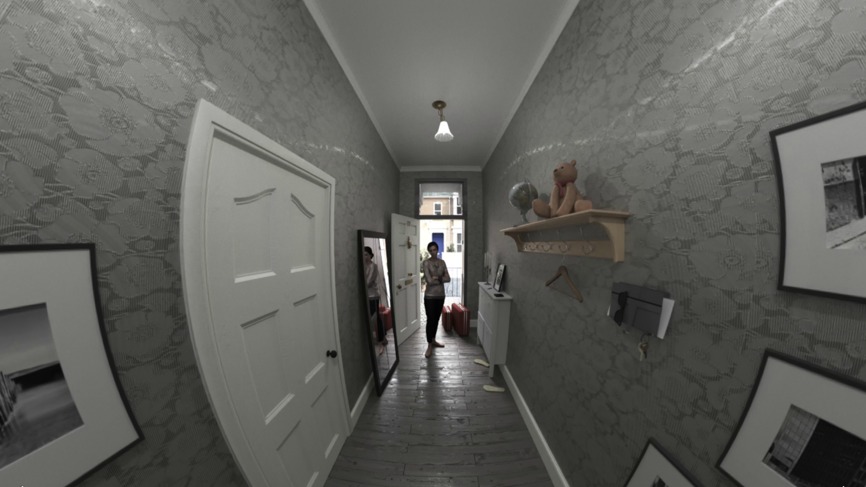Jure: The scene had two major requirements: It needed to feel realistic and the hotspots had to be in optimal positions. So although live-action video would have been great, it would be hard to iterate on it quickly. Instead, we went for a fully custom photorealistic 3D render to set the direction for the feeling and interactions of the story. We hit a bit of a wall with Unity, but luckily there was an Android developer floating around. Since at that point it was clear what we needed to make, we wrote a pretty dirty Cardboard/GearVR app directly in Java. Just to put it in context, I think it took us around a week and a half for all of this.