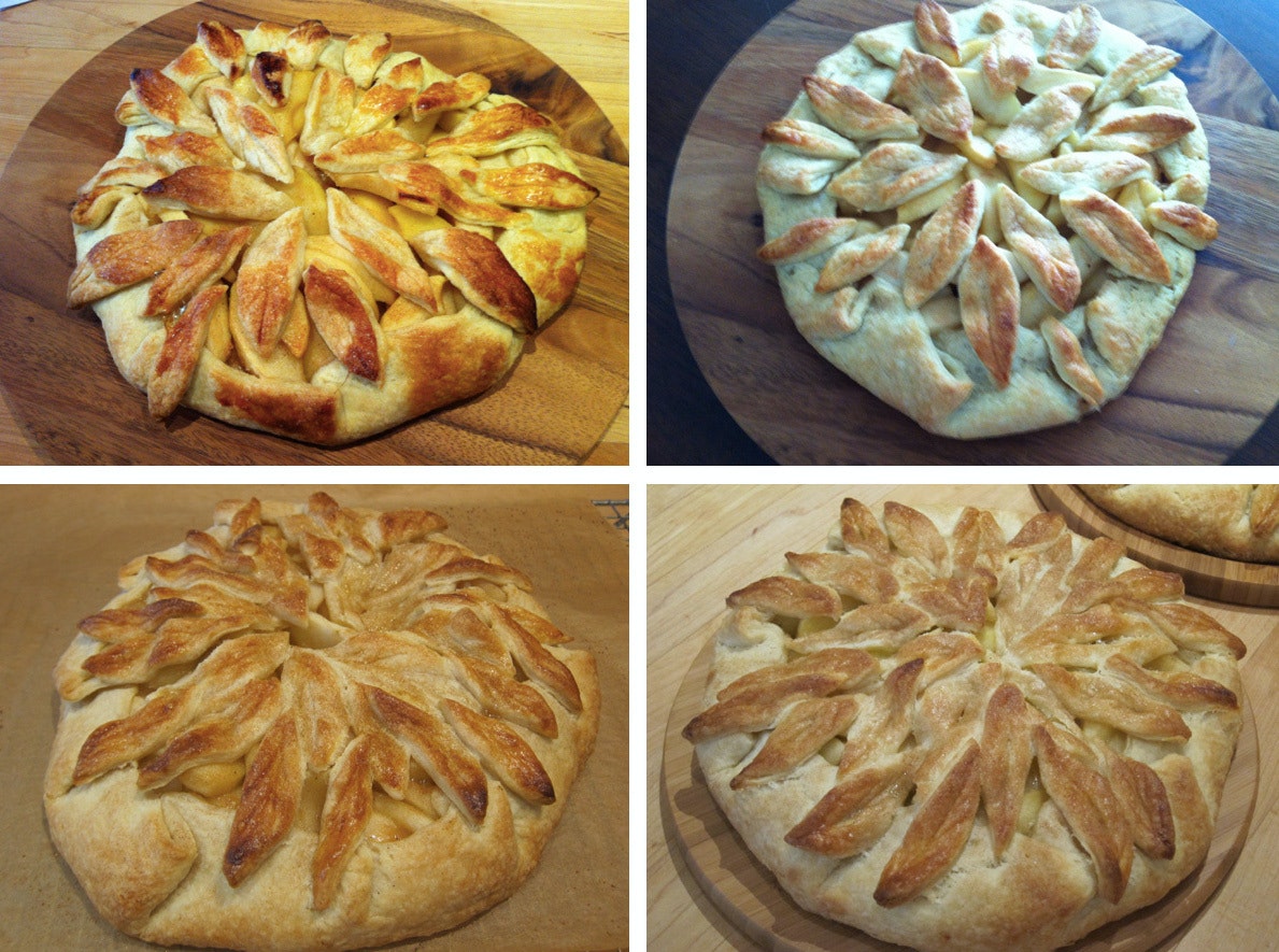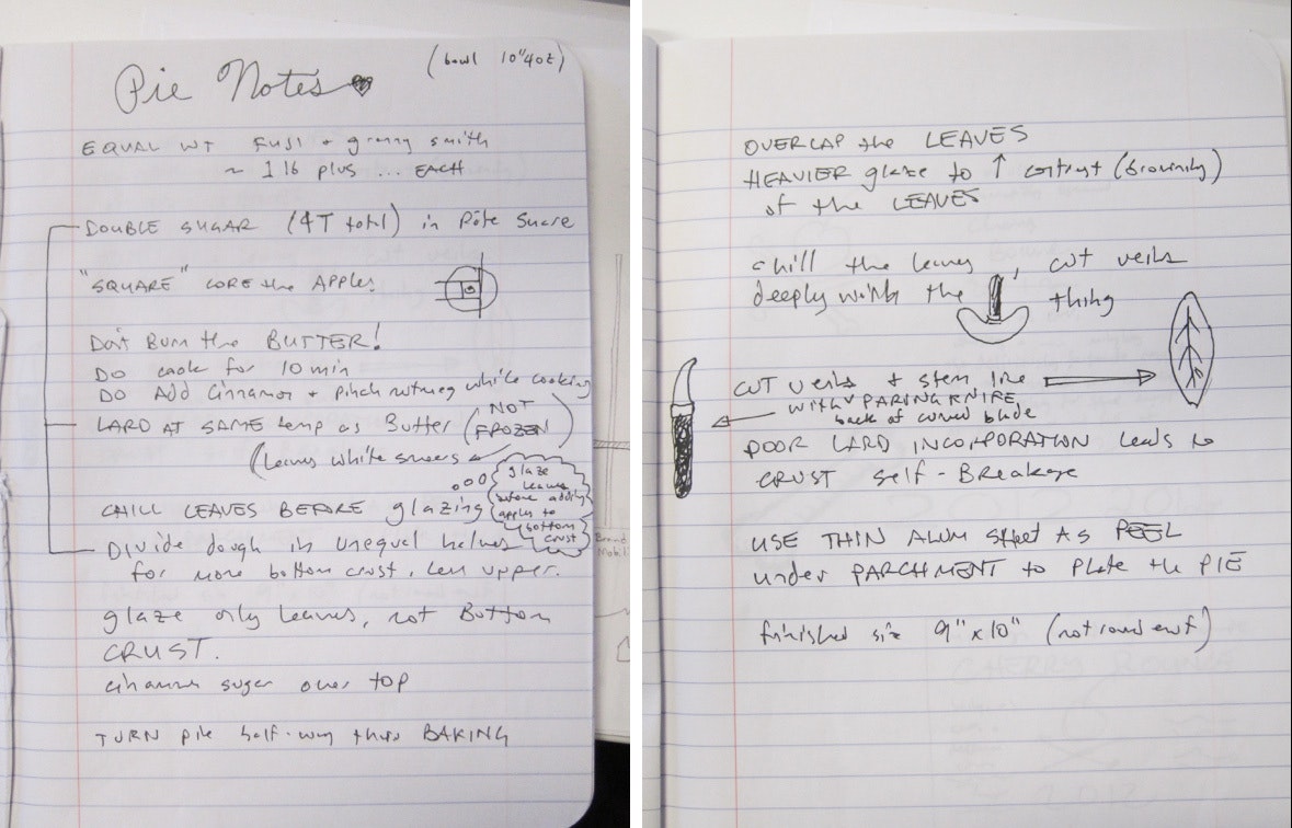 I went “off-recipe” and doubled the sugar in the pastry. Too sweet on its own perhaps, but not when paired with the tart apples and lemon of the pie. The contest demanded a double-crust, but I thought lattice tops were mundane, so my wife researched alternatives, which led to me devising a method of cutting apple-leaf shapes with a mezzaluna and trying three different knives before hitting on the perfect leaf-veining technique. When the dough leaves browned unevenly, a friend suggested glazing them individually before assembling. I taught my daughters how to peel apples in one strip and even experimented with prettier ways to core the apples