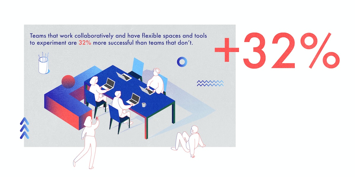 Modern work environments should encourage, but not dictate, the most productive behaviors. The idea is to design an environment that encourages the collaboration and experimentation so crucial to creative work, while also empowering teams to adapt as new challenges arise. Data shows that teams that work collaboratively and have flexible spaces and tools to experiment are 32 percent more successful than teams that don’t.