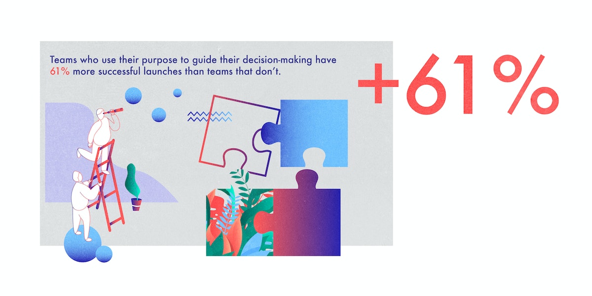 Illustrate the future of your team to show your colleagues what they’re working toward, and what new behaviors they’ll need to adopt to get there. A vision for the future should not only create a shared understanding about what needs to change, but more importantly, explain why. To get started, identify who it is you’re serving, what value your team can provide, and what you need to achieve your goals. Next, create a set of guiding principles to help contain the scope of the initiatives you’ll take on. This list will help you maintain focus, and avoid doing too much at once. Then, compare these guiding principles with the strategic priorities of your organization to make sure that your plan is scalable, will have a positive impact on your business, and can influence the daily work of your teams. According to our research, teams that use their purpose to guide their decision-making have 61 percent more successful launches than teams that don’t.