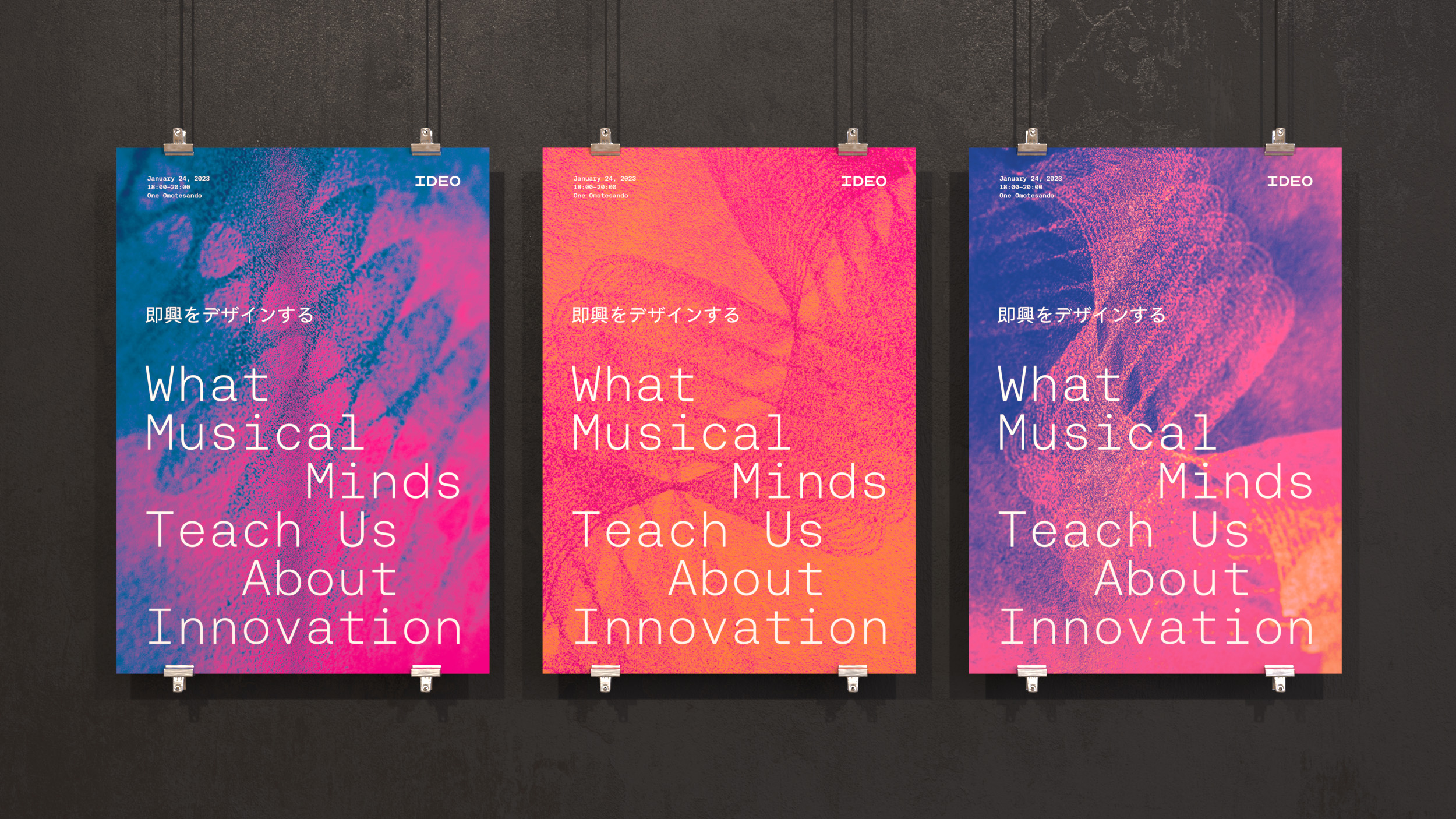 IDEOのパートナーであるマイケル・ヘンドリックスの音楽をテーマにしたイベントのために作ったポスターとブランディングも、従来のグラフィックデザインをサポートするようなプログラミングの活用のひとつです。ポスターのデザインでは、楽器のシンセサイザーに使われている波形のアイデアと、マイケルの著書Two Beats Ahead のテーマである「ありえない組み合わせでデザインのインスピレーションを得る」ということを参考にしました。「シンセサイザー風の波形と紙」という、ありそうでなかった組み合わせで、イベントのビジュアルを作ることにしたのです。