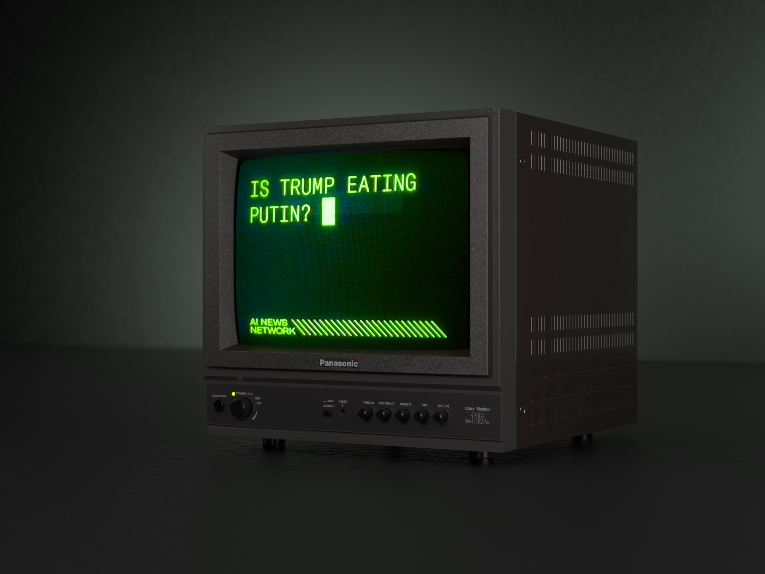 このプロジェクトの最新版である「AI News Network」は、1時間ごとに実際のニュースの見出しを自動的にダウンロードし、見出しの単語を形容詞や名詞などの品詞に分類し、ランダムに新しいフェイクニュースの見出しとして組み立てます。ヴィンテージのブラウン管画面には、私が作成した偽のブランド名が表示され、無限に続くヘッドラインが表示されます。私が書いたプログラムは、プロジェクトの内容を自動的に生成するクリエイティブパートナーとしての役割を果たしてくれます。見出しの作成は、プログラムに任せているので、うっかり信じてしまいそうになるような、でもやっぱり荒唐無稽なコンテンツに、私自身驚くことがあります。「インドネシア、ボブ・ディランを非難」のような偽の見出しを見ると、ボブ・ディランがインドネシアを怒らせるようなことをしたのだろうかと思うし、「サル男、ジョー・バイデンからの支持を撤回」のような無意味な見出しにはただ苦笑してしまいます。