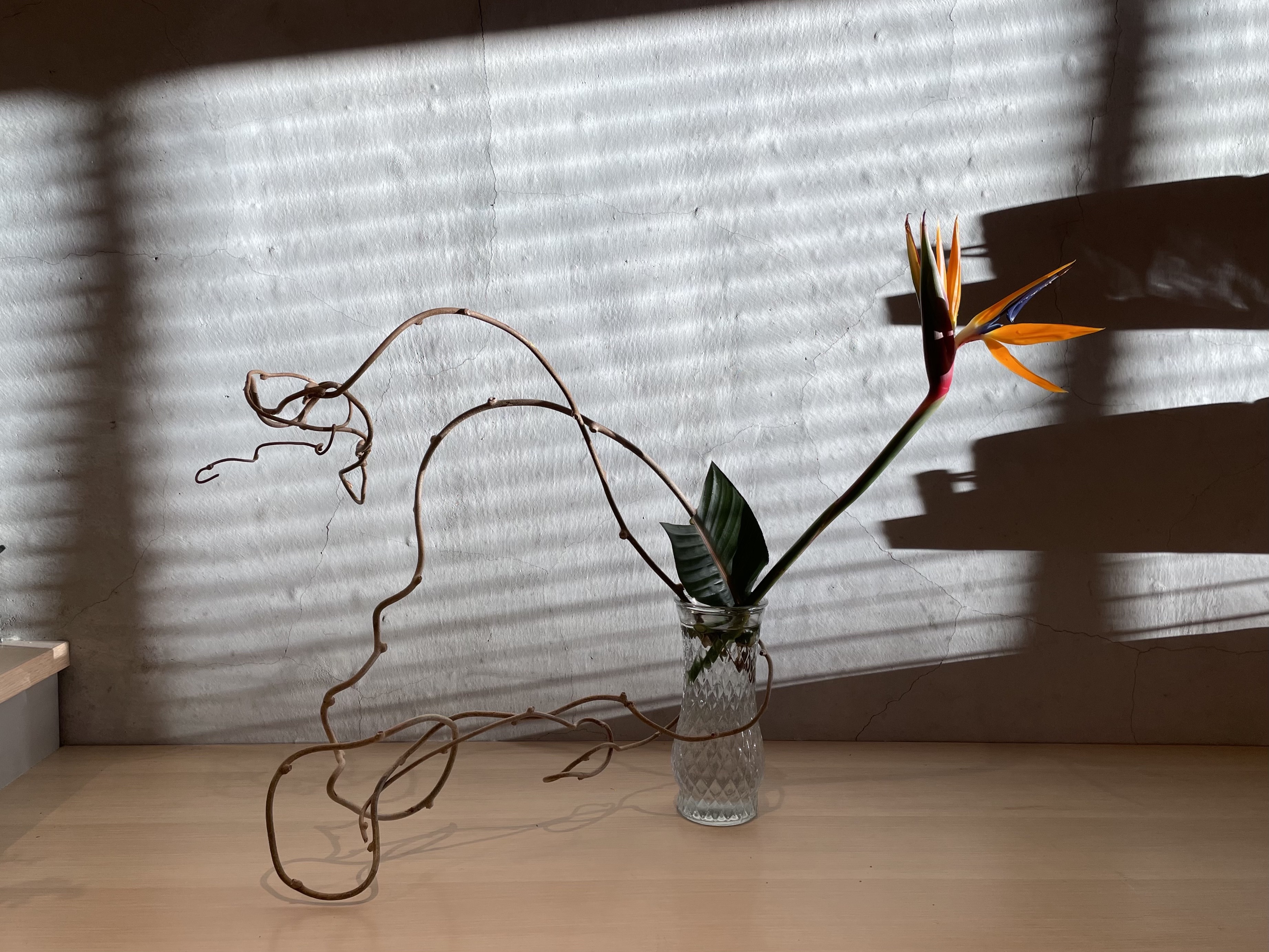 いけばなを習い始めて一番驚いたのは、切ることが意外にも怖いということ。花の輪郭や枝の美しさ、「線」や「余白」を際立たせるために、小枝や葉を切り落とす。でも、一度切ったら後戻りができない。繊細さのなかに、結構、勇気と大胆さがいる。