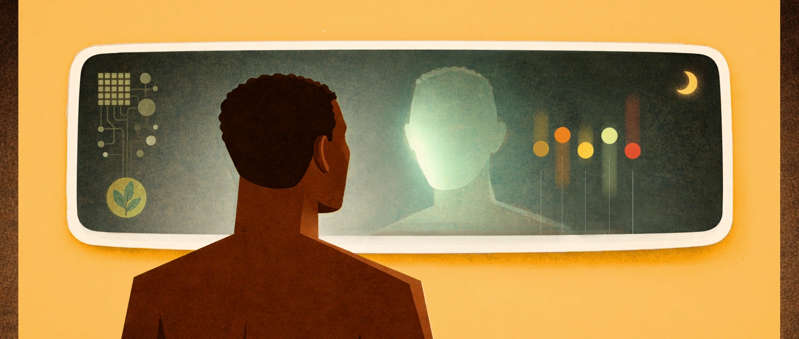After three months, the mirror notices your sleep quality degrades during a particular recurring time of the week. On Monday morning it surfaces a single line beneath your reflection: “Sleep is typically shorter on Mondays.” The next Sunday, you go to bed an hour earlier. The mirror notices. Over time it learns what kind of attention you actually respond to, because you taught it through the way you live and react. The device you have at the end of the year is not the one you started with—and neither are you.