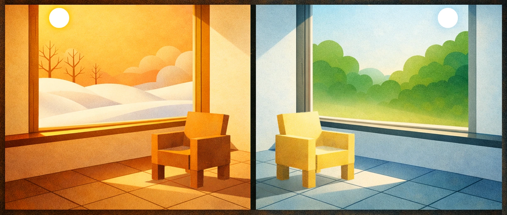 A sheet of AI-embedded glass replaces a traditional living room window. The glass learns sunlight patterns, outside temperatures, and occupants’ daily rhythms. When the afternoon sun becomes harsh, the glass subtly softens and diffuses the light, giving the room a warm, painterly glow. On cold winter mornings, it lets in full sunlight to warm the space. There are no visible controls and no notifications. The window functions as an intelligent material, shaping light and heat in ways that feel natural, healthy, and beautiful.