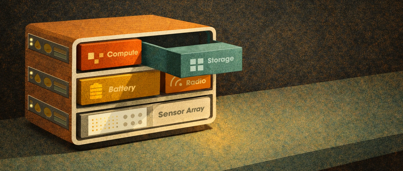 A small wood and aluminum hub sits on a shelf, running local AI models for the home. Each component slides out like a drawer: Compute, Storage, Radio, Battery, and Sensor Array. While these modules are functionally co-dependent, each one is discrete. For instance, whenever new AI chips are released, the owner can simply replace only the Compute drawer.