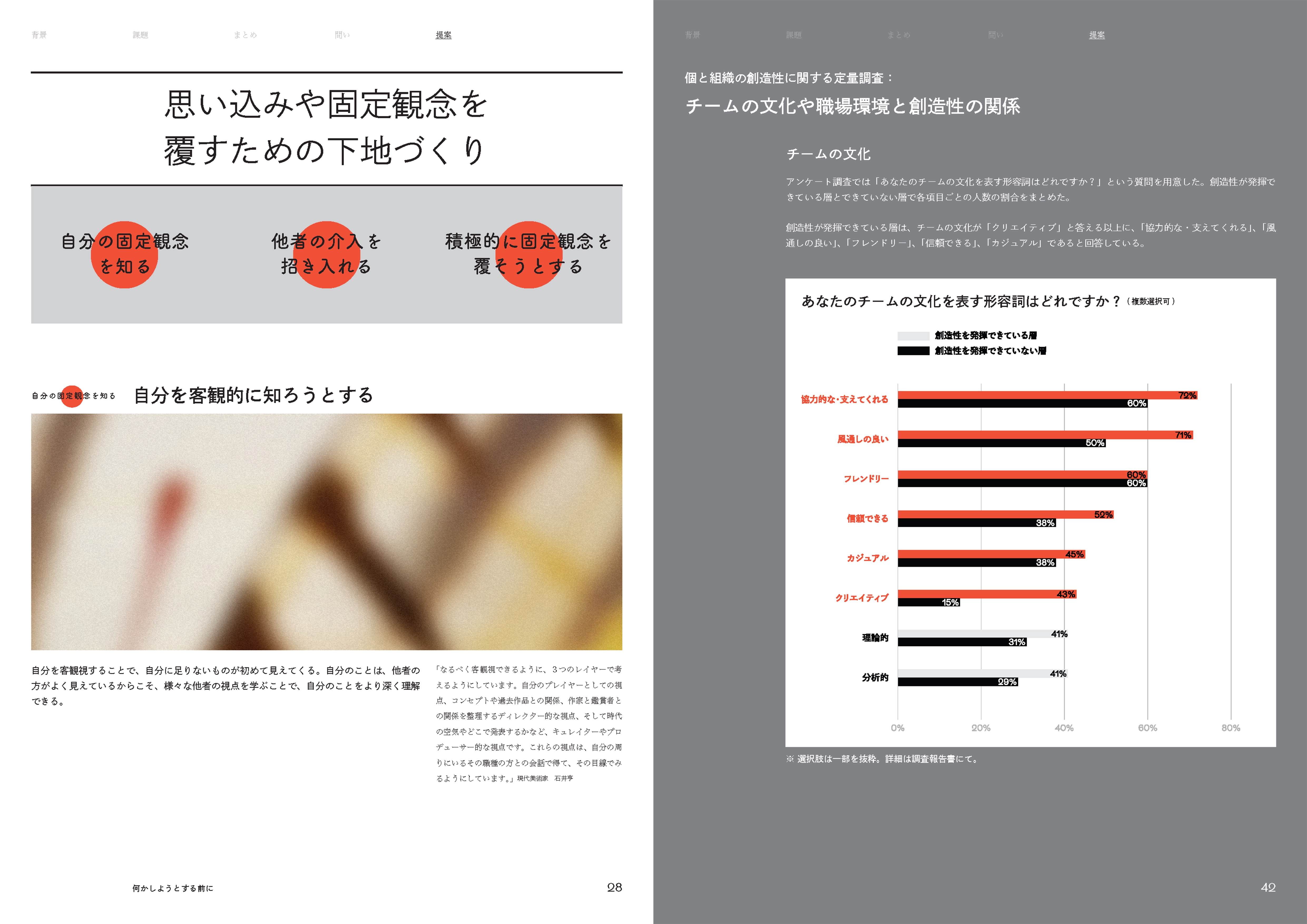 こうしたプロセスの中で浮かび上がってきたのは、日本社会における創造性に対する思いこみ。創造性は、一部の個に宿るものではなく、さまざまな人・モノ・コトの掛け合わせで生まれる。だからこそ、個の創造性を求める前にまず、どのように創造性が開きやすい環境を作ることができるのか。ここから、「どのようにして、固定観念を覆し、個々が問い続けられる土壌を作ることができるか?」という問いが生まれ、個と組織の創造性を高めるための考え方を「提案」として整理しました。