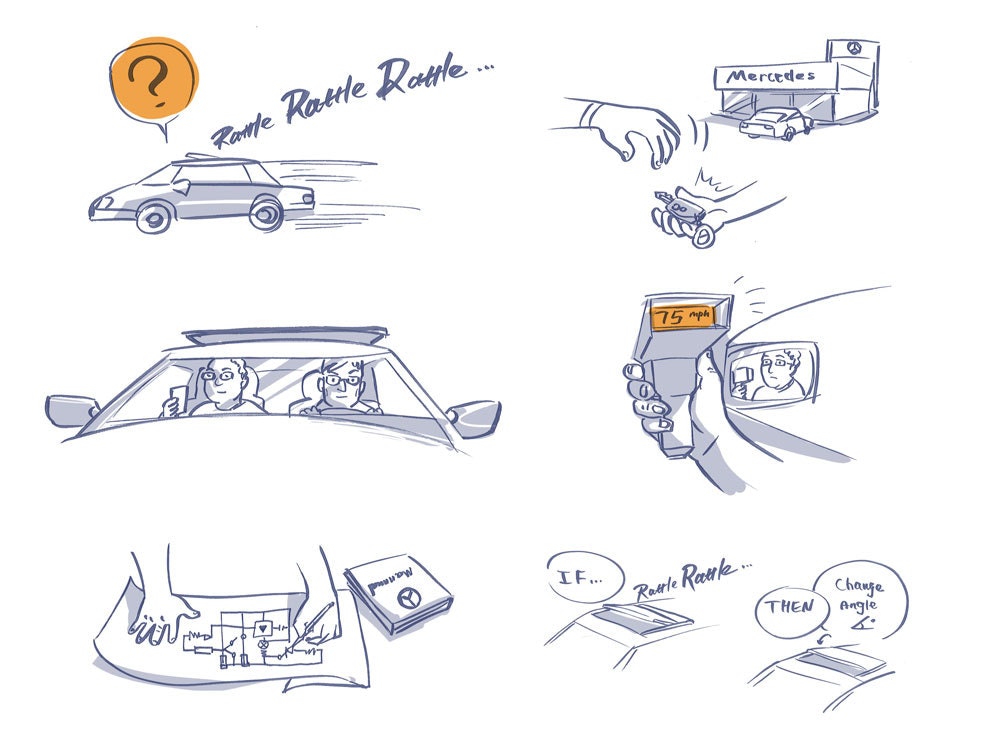 IDEO’s workaround: My colleague Thomas Enders and I borrowed a brand new Mercedes-Benz and went for a ride! We brought along an oscilloscope (or “O-scope”) to measure the frequency and intensity of the sound waves of the buffeting effect at various speeds. With Thomas at the wheel, I held the O-scope, connected to a barometric sensor. This way, we were able to measure what was happening every time the buffeting started up.